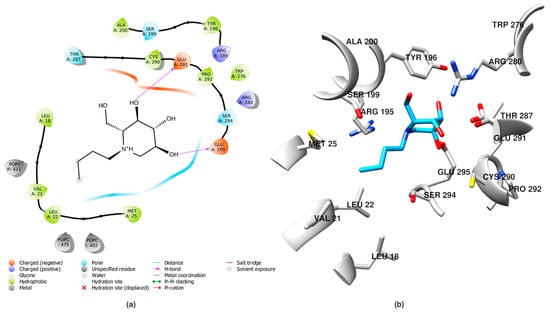 FM analysis. (a) Miglustat representation in binding site, identified as having the lowest energy. (b) Miglustat interactions analyzed using the Maestro Schrödinger software ligand interaction tools, displaying inhibitor–receptor interactions including hydrophobic contacts, H-bonds, salt bridges, π–cation interactions, π-stacking, water bridges. This result derives from the analyses of the stable conformation obtained with the well-tempered FM simulation.