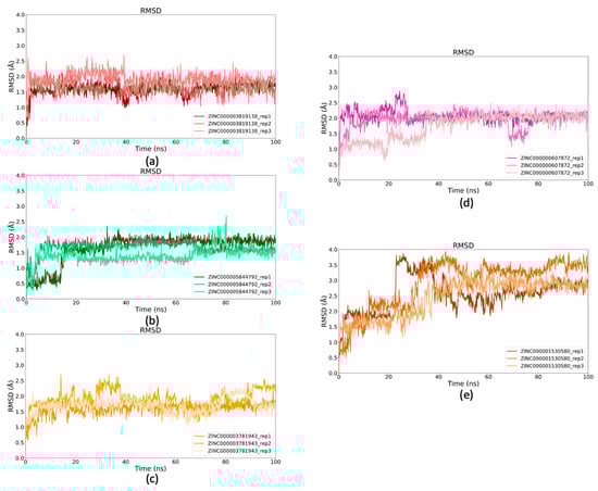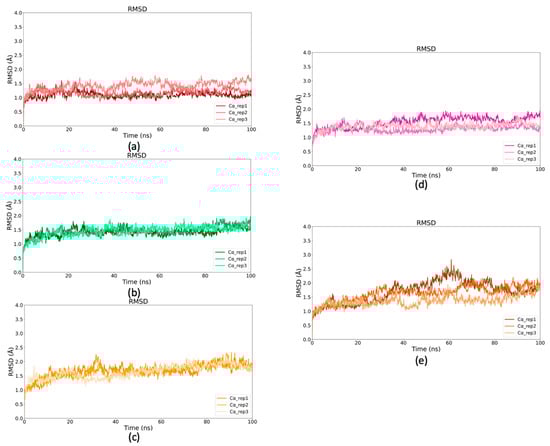 MD simulations to evaluate the stability of protein–ligand complexes using GROMACS 2021.4 [] software with the CHARMM36m [] were performed. Each complex underwent 100 ns of MD simulation, with a total of 5 systems prepared. System setup was carried out using the CHARMM-GUI server [], employing the Membrane Builder tool to generate a phospholipid bilayer. Each system was embedded within a POPC bilayer, and system neutrality was maintained by balancing the total charge with K⁺ and Cl− ions, resulting in a 0.15 M salt concentration. Simulations were conducted at 303.15 K, with coordinates saved every 0.2 ps. Stability was assessed by analyzing the RMSD of the complexes to monitor conformational changes and overall structural stability.