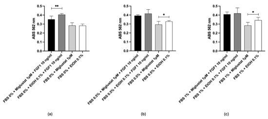 Miglustat in vitro test. (a) 3T3 Swiss fibroblast proliferation after treatment with Miglustat/EtOH ± FGF1 10 ng/mL with 0% FBS. (b) 0.5% FBS. (c) 1% FBS. * p < 0.05; ** p < 0.01.