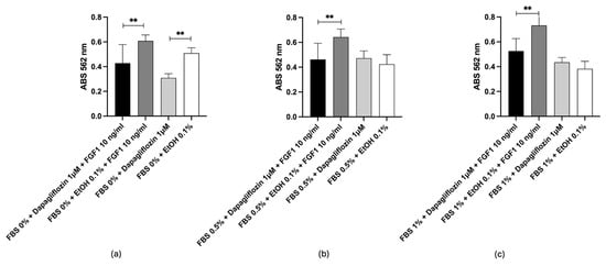 Dapagliflozin in vitro test. (a) 3T3 Swiss fibroblast proliferation after treatment with Dapagliflozin/EtOH ± FGF1 10 ng/mL with 0% FBS. (b) 0.5% FBS. (c) 1% FBS. ** p < 0.01.