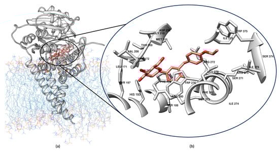 After the successful in vitro inhibition of GCS activity by Dapagliflozin, a detailed structural analysis of its binding mode was performed to gain deeper insights into the molecular interactions underlying its inhibitory mechanism. Cluster analysis was applied to the combined trajectories from three 100 ns MD simulations, and the most representative structure of the GCS–Dapagliflozin complex was extracted. Figure 10 summarizes these findings: panel a shows the location of Dapagliflozin within the GCS binding site, while panel b provides a close-up view of the molecular interactions within a distance of 5 Å, which stabilize the inhibitor. As depicted in Figure 10b, Dapagliflozin interacts with residues critical for GCS activity. Specifically, the inhibitor establishes interactions with key amino acids, including His193, Cys207, Val208, Gly210, Asp236 (important for manganese coordination), and Trp276, which have been previously identified in the literature [,] and confirmed in earlier phases of this study [] as crucial. These interactions, involving residues essential for substrate recognition and catalysis, reinforce Dapagliflozin’s mechanism of action as a GCS inhibitor.