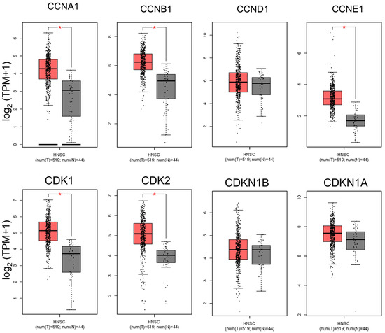Comparison of cell cycle-related gene expression between HNSC tumors and normal tissues. This figure presents a differential expression analysis of key cell cycle-related genes between head and neck squamous cell carcinoma (HNSC) tumor samples and adjacent normal tissues. The genes analyzed include Cyclins A, B, D, and E and CDKs 1 and 2, which are critical for cell cycle regulation and progression through the G1/S and G2/M transitions. The data reveal significant upregulation of these genes in HNSC tumors relative to normal tissues, indicating enhanced cell cycle activity and potential dysregulation in tumor cells. Elevated expression of Cyclin D1, Cyclin E1, and CDK2 supports increased G1/S transition activity, which may facilitate the high proliferation rate characteristic of aggressive cancers like HNSC. Similarly, the upregulation of Cyclin B1 and CDK1 suggests increased G2/M transition activity, emphasizing the role of these genes in the unchecked growth and survival of HNSC cells. (* p < 0.05 compared to the control).
