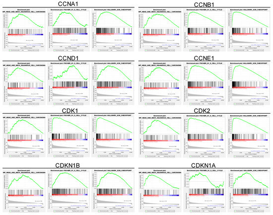 To further elucidate the relationship between these upregulated genes and cell cycle dysregulation in HNSC, we conducted a gene set enrichment analysis (GSEA) of the cell cycle-related gene set in HNSC patients (Figure 2). The GSEA revealed that the upregulated cell cycle-related genes were strongly correlated with pathways governing key cell cycle processes, including DNA replication, G1/S transition, and G2/M transition checkpoints (Figure 2). These enriched pathways underscore the critical role of cell cycle dysregulation in HNSC, implicating the upregulated genes in the enhanced cell division and genomic instability observed in tumor cells. Specifically, the enrichment of the G1/S transition pathway is associated with elevated levels of Cyclin D1, Cyclin E1, and CDK2, which together regulate the cell’s entry into the S phase, initiating DNA synthesis (Figure 2). This process is crucial for maintaining a high proliferation rate, which is characteristic of aggressive tumors like HNSC. Additionally, enrichment of G2/M transition pathways suggests that increased expression of Cyclin B1 and CDK1 accelerates the cell’s entry into mitosis, further supporting the rapid cellular turnover observed in HNSC tumors (Figure 2). In summary, these findings indicate that the cell cycle-related genes upregulated in HNSC tumors are closely associated with enriched pathways controlling DNA replication, G1/S transition, and G2/M transition checkpoints, suggesting a crucial role for these genes in driving tumor cell proliferation and genomic instability in HNSC.