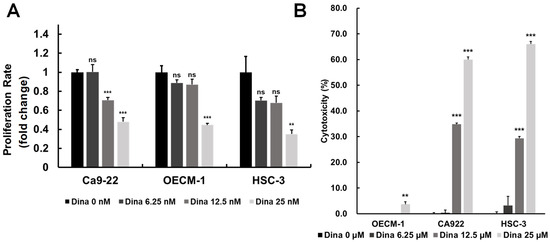 Oral squamous cell carcinoma (OSCC) is a common and aggressive malignancy characterized by rapid growth, resistance to conventional therapies, and high recurrence rates. A key driver of OSCC progression is the dysregulation of cell cycle control, primarily through the overactivation of cyclin-dependent kinases (CDKs) (Figure 1 and Figure 2), which promote uncontrolled cell proliferation [28]. By inhibiting upregulated cyclins and CDKs, it may be possible to disrupt key checkpoints in the cell cycle, slowing tumor growth and reducing proliferation rates. The above findings are particularly relevant to the exploration of CDK inhibitors, such as Dinaciclib, which targets multiple CDKs (including CDK1 and CDK2) and has shown promising effects in inducing cell cycle arrest and apoptosis in OSCC. Therefore, we investigated the effects of Dinaciclib on OSCC proliferation and cytotoxicity. Treatment with Dinaciclib demonstrated a dose-dependent effect on cell viability across the OSCC cell lines Ca9-22, OECM-1, and HSC-3 (Figure 3A). Treatment with 6.25 nM Dinaciclib did not significantly affect cell proliferation in any of the OSCC cell lines. At 12.5 nM, cell viability decreased significantly only in Ca9-22 cells, with no notable changes in the OECM-1 or HSC-3 cells. At the highest concentration (25 nM), Dinaciclib significantly reduced cell viability across all cell lines, reaching up to 80% inhibition in the Ca9-22 and HSC-3 cells and nearly 70% in the OECM-1 cells (Figure 3A). In addition, Dinaciclib significantly induced cellular cytotoxicity at concentrations above 12.5 nM across all OSCC cell lines (Figure 3B). These findings indicate that while lower concentrations of Dinaciclib have a limited impact on OSCC proliferation, higher concentrations produce a pronounced antiproliferative effect by enhancing cellular cytotoxicity. This dose-dependent inhibition highlights Dinaciclib’s potential as a therapeutic agent in OSCC as it effectively reduces cell viability at clinically relevant concentrations.