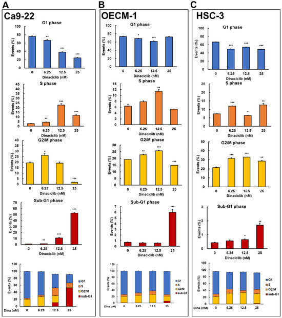 Dinaciclib induces cell cycle arrest at specific phases in OSCC cell lines. OSCC cell lines were treated with Dinaciclib at concentrations of 0, 6.25, 12.5, and 25 nM for 24 h, followed by cell cycle analysis via flow cytometry to determine phase-specific arrest. (A) Ca9-22 cells exhibited a dose-dependent S phase arrest, with an increased S phase population at 12.5 nM and further accumulation at 25 nM. A marked increase in sub-G1 phase cells was observed at 25 nM, indicative of apoptosis. (B) In OECM-1 cells, Dinaciclib induced dual-phase arrest, significantly increasing both S and G2/M phase populations at higher concentrations (12.5 and 25 nM). Sub-G1 accumulation at 25 nM confirmed apoptosis induction. (C) HSC-3 cells showed strong G2/M phase arrest at 25 nM, along with an increase in sub-G1 cells, which is consistent with apoptotic cell death. Statistical significance was determined using an unpaired Student’s t-test (* p < 0.05, ** p < 0.01, *** p < 0.001 compared to the control).