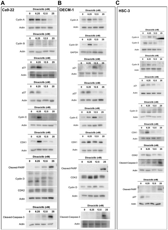 In more detail, the expression levels of Cyclins A and B, which are primarily involved in regulating the S and G2/M phases of the cell cycle, respectively [29], were significantly reduced following Dinaciclib treatment (Figure 5D–F). In Ca9-22 cells, Cyclin A levels dropped markedly, corresponding with the S phase arrest observed in this cell line (Figure 5A,D). Similarly, Cyclin B, a crucial regulator of the G2/M transition, was downregulated in the OECM-1 and HSC-3 cells at higher Dinaciclib concentrations, aligning with the G2/M arrest observed in these cell lines (Figure 5B,E). The decrease in Cyclin B suggests that Dinaciclib disrupts progression through the G2/M checkpoint, further contributing to cell cycle arrest. Cyclins E, which regulate the G1/S transition, were also notably decreased in the OECM-1 and HSC-3 cell lines with increasing Dinaciclib concentrations (Figure 5E,F). Reduced Cyclin E levels in cells additionally correlate with S phase arrest in these cell lines, reinforcing Dinaciclib’s impact on halting the initiation of DNA replication.