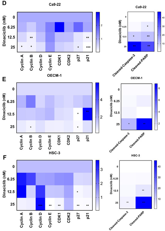 Dinaciclib downregulates key cell cycle regulators and induces apoptotic markers in OSCC cells. OSCC cell lines (Ca9-22, OECM-1, and HSC-3) were treated with Dinaciclib at 0, 6.25, 12.5, and 25 nM for 24 h, and protein expression was analyzed via Western blotting and heatmap visualization. (A–C) Western blot analysis of cell cycle-related proteins and apoptotic markers in Ca9-22 (A), OECM-1 (B), and HSC-3 (C) cells. Dinaciclib treatment led to a dose-dependent decrease in the expression of Cyclins A, B, D, and E, as well as CDKs 1 and 2, across all cell lines. Additionally, cleaved-caspase-3 and cleaved-PARP were significantly upregulated, confirming apoptosis induction. (D–F) Heatmaps representing the relative expression levels of the proteins quantified in panels A, B, and C for the Ca9-22 (D), OECM-1 (E), and HSC-3 (F) cells, respectively. The heatmaps show a graded reduction in Cyclins A, B, D, and E, CDKs 1 and 2, p21, and p27, along with a dose-dependent increase in cleaved-caspase-3 and cleaved-PARP, supporting the dual mechanism of cell cycle arrest and apoptosis induced by Dinaciclib in OSCC cells. Statistical significance was determined using an unpaired Student’s t-test (* p < 0.05, ** p < 0.01, *** p < 0.001 compared to the control).