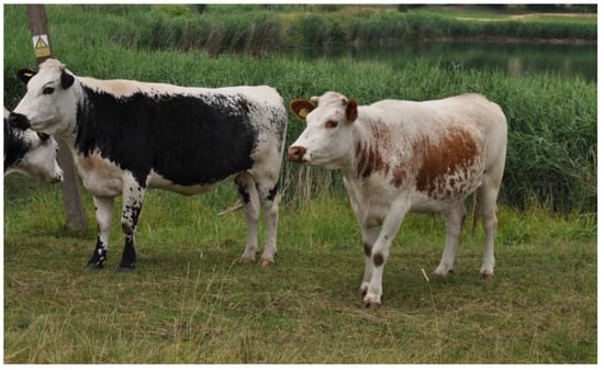 In Poland, among the four cattle breeds included in genetic resources conservation programmes, two stand out: Polish Red and Polish White-Backed. The former, classified as brachyceros, is distinguished by a solid red coat colour (Figure 1) and is concentrated mainly in the south of the country (where it is used for dairy purposes) and in the north (where it is raised for meat) [15]. Polish White-Backed cattle, classified as primigenius, have a characteristic colouring with a white stripe on the back (Figure 2). Their range encompasses the entire country, although the highest numbers are kept in the east [16]. Both of these breeds are indigenous and dual-purpose but used mainly for dairy production.