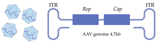 The genome of a wild-type AAV is a 4.7 kb single-stranded DNA (ssDNA) (Figure 1), and it consists of a pair of 145 bp at each end of the single strand, thereby forming a hairpin structure and several functional gene families: the rep gene encoding four isoforms of non-structural proteins, which are required for replication and packaging; the cap gene encoding VP1, 2, and 3 capsid proteins in one open reading frame (ORF); and the assembly-activating protein (AAP) in a separate ORF, which is necessary for capsid assembly [19].