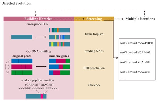 The directed evolution strategy involves first building a library of randomly mutated AAV variants, followed by isolating specific mutants with prospected properties such as BBB penetration, tissue tropism, or enhanced transduction (Figure 5) [11,96]. Methods for generating diverse libraries consist of error-prone PCR and a staggered extension process [97], a DNA shuffling-based approach [98,99], the random peptide insertion into surface regions [100,101], etc. For example, the Cre recombination-based AAV targeted evolution (CREATE) system, which attaches short-length peptides to the rAAV9 capsid, was used to generate an AAV-PHP.B. variant that could penetrate the BBB in C57BL/6 mice but not in other mice strains or NHP [100,102,103]. Further studies need to consider cross-species transfection problems. A novel rAAV evolution platform termed TRACER (tropism redirection of AAV by cell-type-specific expression of RNA) was then created through random peptide insertions in a cell-type-specific manner [101]. A study reported that 10 variants based on rAAV9 showed over 400-fold higher brain transduction following systemic administration [104].