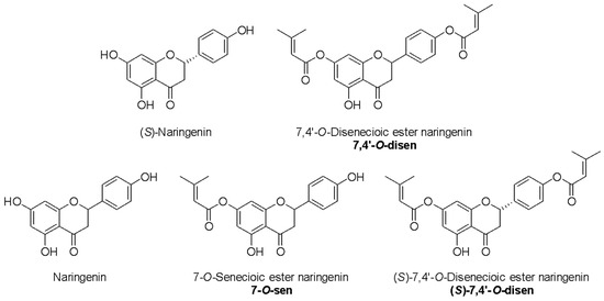 Chemical structure of flavanones naringenin, (S)-naringenin, 7,4′-O-disenecioic ester naringenin, (S)-7,4′-O-disenecioc ester naringenin, and 7-O-senecioc ester naringenin.