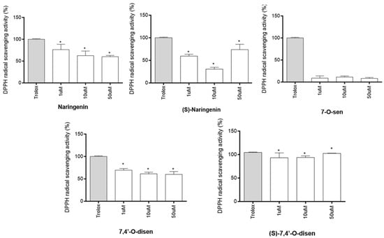 We tested, first, if the flavonoids naringenin, its isomer (S)-naringenin, and the senecioic acid ester derivatives 7,4′-O-disen, (S)-7,4′-O-disen, and 7-O-sen have similar antioxidant capacities using the DPPH cell free assay at growing concentrations of 1, 10, and 50 µM. This test involves the elimination of the DPPH free radical and is one of the methods most used to screen compounds with antioxidant activity due to its low cost, speed, and accessibility for measuring the antioxidant properties of phenolic substances and extracts [19]. Among the flavonoids tested, four of them showed a capacity greater than 50% in eliminating free radicals at the concentration of 1 µM; these were (S)-7,4′-O-disen (93.10%), naringenin (76.06%), (S)-naringenin (59.19%), and 7,4′-O-disen (69.68%). On the other hand, 7-O-sen did not present antioxidant activity in this assay at any concentration tested. However, from the concentration of 10 µM, the antioxidant capacity of the compounds naringenin and 7,4′-O-disen were reduced but were still significant. Only (S)-7,4′-O-disen showed a capacity greater than 50% in eliminating free radicals in the three concentrations tested when compared with Trolox (standard) in the same concentrations (Figure 2).