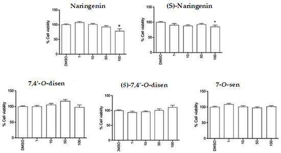 For use in the tests: naringenin, (S)-naringenin, and the three senecioic acid ester derivatives 7-O-sen, 7,4′-O-disen, and (S)-7,4′-O-disen were diluted in dimethyl sulfoxide (DMSO) at a concentration of 100 mM, forming stock solutions, and kept at −20 °C. As a control condition, dimethyl sulfoxide (DMSO), the vehicle for diluting the molecules in equivalent volume (maximum 0.1%), was considered. The final dilutions of each molecule were prepared according to previous studies with hydroxylated flavonoids [20,21] and diluted directly in a DMEM culture medium free of fetal bovine serum (FBS) for cell treatment.