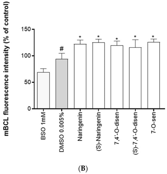 Effect of naringenin and senecioic acid ester derivatives on astrocytes’ glutathione (GSH) depletion using the monochlorobimane (MCB) test. (A) Images of astrocyte cultures 24 h after treatment with D,L-buthionine-(S,R)-sulfoximine (BSO, 1 mM) or with the flavonoids naringenin, (S)-naringenin, 7,4′-O-disen, (S)-7,4′-O-disen, or 7-O-sen at 5 µM; control cultures were treated with equivalent volumes of the vehicle of flavonoid dilution (DMSO 0.005%); objective 10x, scale bars = 50 nm. (B) Graph showing the relative fluorescence measurement; values are mean ± SEM (n = 3); Data were analyzed using One-way ANOVA followed by Tukey’s multiple comparisons post-test. (*) indicates a statistical difference relative to the negative control (DMSO 0.005%); (#) indicates a statistical difference (p < 0.05) between the negative and positive control BSO (1 mM).