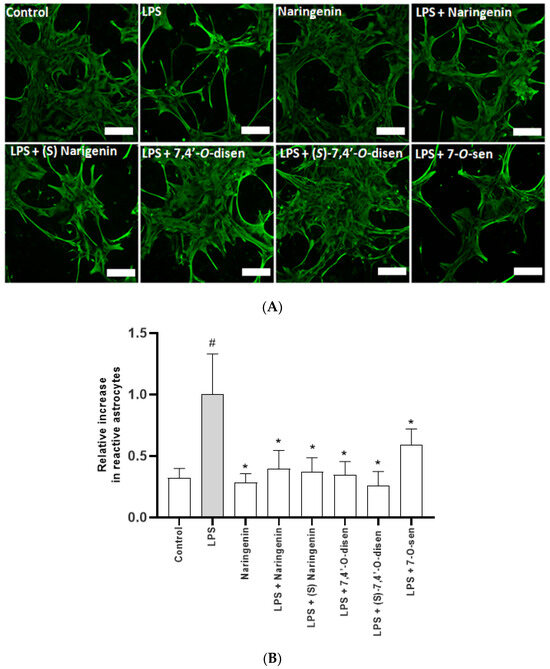 Glial fibrillary acidic protein (GFAP) is a component of intermediate filaments specific to the cytoskeleton of astrocytes and is directly related to cell phenotype associated with astrocytes’ reactivity [1,2,54], and a change in its expression and, consequently, in astrocyte morphology, is considered one of the primary features of astrocytes’ reaction to different insults, including inflammation with LPS. Hence, we investigated the effect of naringenin, (S)-7,4′-O-disen, and 7-O-sen on GFAP expression in astrocytes subjected to inflammatory damage with LPS. For this, astrocytes (7.5 × 104 cells/cm2) were plated in 6-well chamber slices, pre-sensitized with poly-ornithine (50 μg/mL, Sigma-Aldrich P0671), and 24 h later, the cells were treated with LPS (1 µg/mL, 24 h), treated for 24 h with the compounds (10 µM), or maintained in control conditions (DMS 001%) and then processed for immunofluorescence analysis. After time treatments, cultures were washed three times with PBS and fixed with ice-cold methanol for 10 min at −4 °C. Afterward, the methanol was discarded, and the plates containing the fixed cells were stored at −8 °C until immunofluorescence was carried out. Cells were rehydrated with PBS for 30 min under agitation in a shaker. Afterward, non-specific bindings were blocked by pre-incubation of coverslips for 30 min with 5% BSA diluted in PBS. Cells were incubated with primary antibodies (rabbit anti-GFAP polyclonal; DAKO Z0334; 1:500, Merck, Darmstadt, Germany) and diluted in 1% BSA in PBS for 3 h, following the dilution instructions according to the manufacturer. After this, the cells were washed 3 times with PBS and incubated with secondary antibodies (goat anti-rabbit IgG-polyclonal conjugated with Alexa Fluor 488, Invitrogen A11008, 1:1000) for 1 h at room temperature and diluted in 1% BSA in PBS, following the concentration indicated by the manufacturer. Three new washes with PBS were performed, and the nuclear chromatin was stained with the fluorescent DNA intercalating agent 4′6-diamidino-2-phenylindole (5 μg/mL; DAPI, Invitrogen—Probes Molecular, Eugene, OR, USA) for 5 min in a dark chamber at room temperature. After these steps, analysis was performed by fluorescence microscopy (Leica DCF7000T, coupled to the AxioCam HRm camera Leica, Nussloch, Germany), where 6 randomized fields were photographed for each treatment and culture, and the generated images were analyzed using ImageJ 1.33u Software (Wayne Rasband, National Institutes of Health, USA).