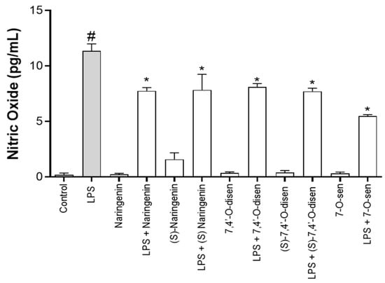 Considering that astrocytes express inducible oxide nitric synthase (iNOS), an enzyme responsible for nitric oxide (NO) production under inflammatory conditions and associated with neurodegeneration [24,25], we measured NO levels in the medium of the astrocyte cultures under different conditions. The cultures were treated on the first day with LPS (1 µg/mL) for 24 h, and after this period, they were treated with the study molecules (10 µM) for 24 h. LPS treatment induced an increase in NO when compared with the control cultures (DMSO 0.01%). This increase in NO promoted by LPS was significantly reduced by treatments with the flavonoid naringenin and its synthetic derivatives (S)-7,4′-O-disen or 7-O-sen compared with cultures subjected to the inflammatory damage (Figure 6).