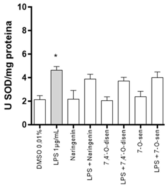 Total of superoxide dismutase one (SOD1) activity in astrocyte primary glia culture. Cultures were exposed or not to LPS (1 µg/mL) for 24 h and treated with the flavonoids naringenin, (S)-7,4′-O-disen, or 7-O-sen at 10 µM or maintained in control conditions (DMSO 0.01%). Results expressed as means and triplicates analyzed by the Kruskal–Wallis ANOVA test followed by Dunn’s post-test. (*) representing p < 0.05 with a statistical difference about the control (0.01% DMSO).