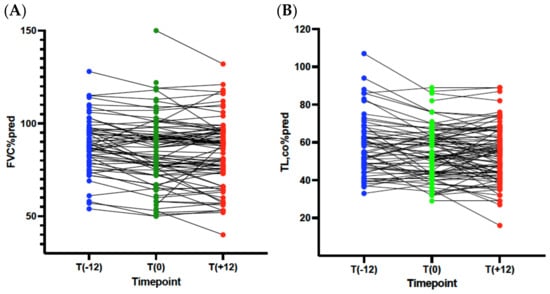 Changes in PFTs before and after treatment. (A). FVC %pred, (B). TL,co %pred. FVC %pred—forced vital capacity, %predicted; TL,co %pred—transfer factor of the lungs for carbon monoxide, %predicted; T (−12)—within a year before treatment initiation, T (0)—at treatment initiation, T (+12)—after 12 months of treatment.