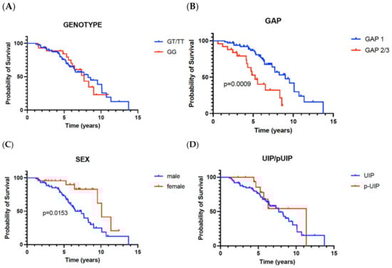 Kapplan–Meier survival curves according to different factors. (A)—genotype (GG versus GT/TT), (B)—GAP (stage 1 versus stages 2 or 3), (C)—sex (male versus female), (D)—HRCT pattern (UIP versus probable UIP). GAP—Gender–Age–Physiology Index, UIP—usual interstitial pneumonia, pUIP—probable usual interstitial pneumonia.