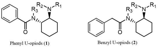Generic structures of U-type opioid compounds: (1) phenyl U-opioids, (2) benzyl U-opioids. These utopioid scaffolds can appear with several types of substitutions: (i) the aromatic ring by 1 or 2 halogen atoms or a trifluoromethyl or methylenedioxy group; (ii) R3 = H or an alkyl (e.g., methyl, ethyl, or isopropyl); (iii) R1 and R2 are usually the same alkyl substituent (e.g., methyl, ethyl, or belonging to a pyrrolidinyl group); (iv) the cyclohexyl by tetrahydrofuran (THF), forming a spirocyclic moiety.