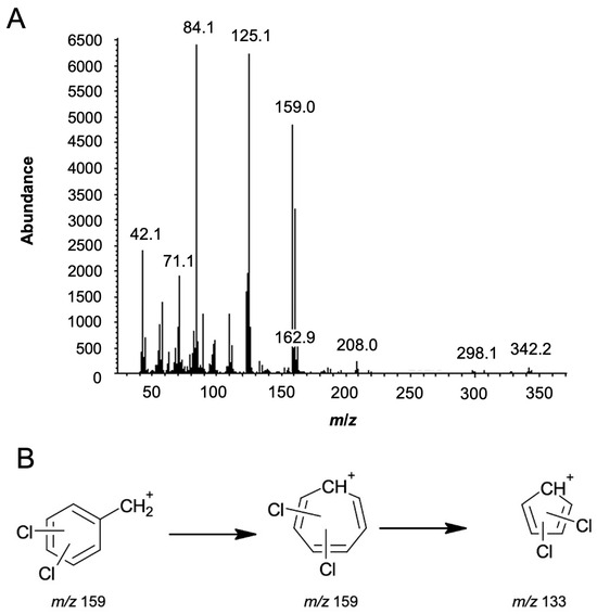 Nevertheless, the most important set of peaks is at m/z 159, 161, and 163, which correspond to the characteristic isotopic pattern indicating the presence of two chlorine atoms in the structure, with an abundance ratio of 9:6:1. Figure 3B shows the possible fragment at m/z 159 and its transformation to the fragment at m/z 133. Moreover, peaks at m/z 110 and 112 suggest the loss of a chlorine atom from the phenyl ring fragment, with an isotopic pattern of 3:1 (abundance 1500:500), which is characteristic of the presence of a single chlorine atom. Additional fragment ions were observed at m/z 125, 97, 71, and 58, which match those in the spectral library. The m/z 125 and 97 correspond to the radical cation N,N-dimethylcyclohexanamine, followed by the elimination of the ethylene group. The m/z 71 and 58 fragments are suggested to result from the cleavage of the cyclohexane ring.