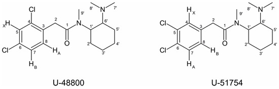 Notwithstanding the NMR identification, the full NMR assignment of U-48800 presented in Table 1 was made for future reference. Since there is no previous assignment in the literature for this molecule or for other similar U-type opioids, such as U-47700 and U-49000, NMR assignment attempts are incomplete [14,16,17].