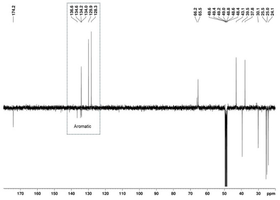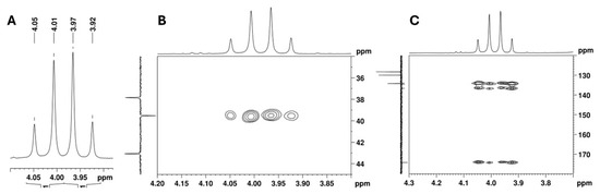 The 13C APT signal at 39.5 ppm, attributed to the C-2 carbon linked to the aromatic moiety, correlates in the HSQC with the signals from two diastereotopic protons that form an apparent quartet at 3.99 ppm (Figure 9A,B). Its complex hyperfine structure corresponds to an AB spin system of a methylene group, with a geminal coupling constant of 16.8 Hz. In the HMBC spectrum, these protons show cross-peaks with the deshielded carbon signal at 174.2 ppm, which is characteristic of a carbonyl carbon (Figure 9C). This confirms the presence of a methylene group between the aromatic moiety and the carbonyl group and allows the signal at 174.2 ppm to be assigned to the carbonyl carbon at C-1.