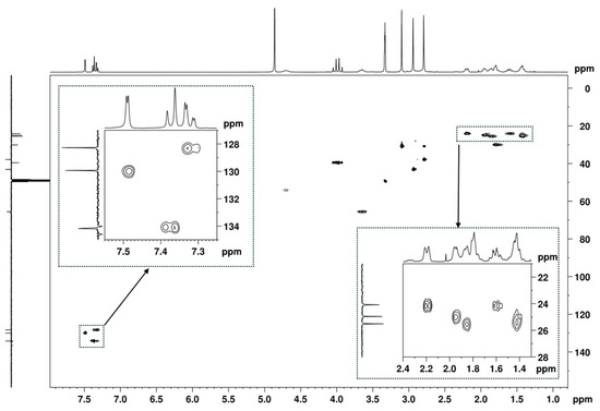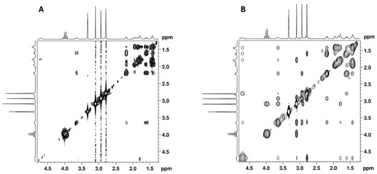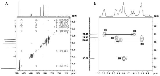 The remaining NMR 1H signals (Figure 5) were easily assigned to the cyclohexane moiety through the TOCSY correlations of H-1′ shown in Figure 12A, along with the corresponding carbon 13C signals identified by HSQC cross-peaks (Figure 7 and Figure 12B). Despite the overlapping signals of some protons, the presence of three pairs of diastereotopic protons corresponding to three methylene groups can be observed (13C/1H 25.5/1.86 and 1.42 ppm; 25.0/1.95 and 1.42 ppm; 24.1/2.19 and 1.61 ppm). There is also one pair with quasi-equivalent protons (13C/1H 30.1/1.79 ppm). This was expected since axial and equatorial protons of substituted cyclohexane have different chemical shifts. Furthermore, apart from the methine group at C-1′ (13C/1H 54.2/4.70 ppm), the methine group (13C/1H 65.5/3.65 ppm) linked to the -N(CH3)2 group also belongs to the cyclohexane ring. Both methine proton signals appear as broad multiplets without hyperfine structure, indicating a chemical environment that induces rapid proton spin relaxation.