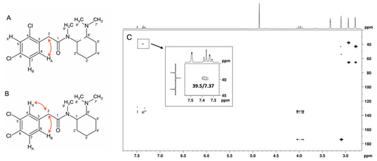Although both compounds have an ABX spin system, the HMBC correlation of the HA signal, one doublet at 7.37 ppm (J = 8.12 Hz), with the methylene carbon at 39.5 ppm is only compatible with the structure of U-48800 (Figure 8). This allows the NMR aromatic methine signals at 1H/13C 7.49/129.9, 7.32/128.3, and 7.37/134.2 ppm to be assigned to positions C-5, C-7, and C-8, respectively, while the signal at 39.5 ppm is assigned to the methylene group at C-2 (Table 1). In the structure of U-51754, the proton HA and C-2 are separated by four bonds, so it would not be possible to see an HMBC correlation between them (Figure 8B).