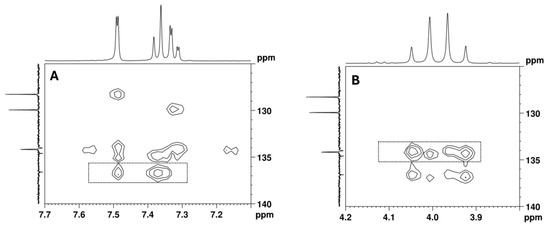 The remaining aromatic carbons of the 1,2,4-trisubstituted benzene appear at 136.6, 134.6, and 134.0 ppm. The HMBC experiment allowed for the assignment of the 13C signal at 136.6 ppm to C-4 since this signal shows correlations with the aromatic protons at 7.49 (H-5) and 7.37 (H-8) ppm, as well as with the C-2 methylene protons at 3.94 and 4.03 ppm, together with the lack of a correlation with the H-7 proton at 7.32 ppm (Figure 10). However, the overlap of the cross-peaks from the correlations of the carbons at 134.0, 134.2, and 134.6 ppm with the aromatic protons suggests that each of the quaternary signals at 134.0 and 134.6 ppm can be assigned to C-3 or C-6.