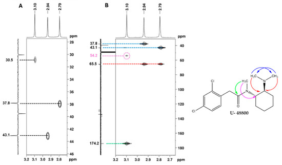 NMR spectra of the utopioid sample expanded in the regions of the key correlations of the N-methyl groups: (A) [1H-13C]-HSQC, (B) [13C-1H]-HMBC and structure of U-48800 showing key [13C-1H]-HMBC correlations. In the figure, blue arrows show 13C-1H correlations between 7′ and 8′ methyl groups; red arrows show 13C-1H correlations between 7′ and 8′ methyl groups with 6′ methine group; the green arrow shows 13C-1H correlations between 9′ methyl group and 1 carbonyl group, and the pink arrow shows 13C-1H correlations between 9′ methyl group and 1′ methine group.
