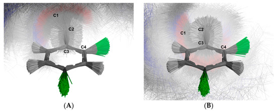 For the aromatic ring, the simulation revealed two distinct clusters of structures based on the C-1-C-2-C-3-C-4 dihedral angles: one group with negative angles and another with positive angles. Figure 14 illustrates the superimposed structures from each cluster. The first cluster (Figure 14A) contains 5158 structures (51.57%), while the second cluster (Figure 14B) comprises 4843 structures (48.43%). This distribution indicates that the aromatic ring does not undergo full rotation around the C-2-C-3 bond, a result consistent with the 1H NMR spectrum.