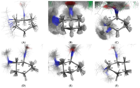 Cluster 4 consists of 33 structures (0.33%) in a boat conformation (Figure 15D). The carbon–hydrogen bond angles relative to the ring plane indicate that C-1′-H-1, C-2′-H-2, C-3′-H-1, C-4′-H-2, C-5′-H-2, and C-6′-H-1 are in axial positions (−76.51° ± 6.56°, −64.36° ± 4.65°, 72.23° ± 6.97°, −52.05° ± 8.22°, −80.27° ± 6.3°, and 82.61° ± 3.96°, respectively), while C-2′-H-1, C-3′-H-2, C-4′-H-1, and C-5′-H-1 are in equatorial positions (25.96° ± 5.93°, −0.43° ± 7.62°, 42.12° ± 7.39°, and 18.09° ± 10.7°, respectively). Cluster 5 includes 74 structures (0.74%) in a boat conformation (Figure 15E). The carbon–hydrogen bond angles relative to the ring plane indicate that C-1′-H-1, C-2′-H-2, C-3′-H-1, C-4′-H-1, C-5′-H-2, and C-6′-H-1 are in axial positions (−55.93° ± 9.3°, −75.61° ± 5.53°, 74.11° ± 6.53°, 63.65° ± 6.34°, −72.52° ± 6.19°, and 69.93° ± 6.65°, respectively), while C-2′-H-1, C-3′-H-2, C-4′-H-2, and C-5′-H-1 are in equatorial positions (15.78° ± 7.12°, −19.13° ± 10.83°, −25.86° ± 8.75°, and 3.33° ± 6.54°, respectively). Cluster 6 also contains 24 structures (0.24%) in a boat conformation (Figure 15F). The carbon–hydrogen bond angles relative to the ring plane indicate that C-1′-H-1, C-2′-H-1, C-3′-H-2, C-4′-H-2, and C-5′-H-1 are in axial positions (−63.55° ± 6.11°, 77.19° ± 4.93°, −70.0° ± 8.4°, −54.64° ± 13.45°, and 76.78° ± 7.16°, respectively), while C-2′-H-2, C-3′-H-1, C-4′-H-1, C-5′-H-2, and C-6′-H-1 are in equatorial positions (−6.36° ± 6.46°, 31.53° ± 8.9°, 50.58° ± 12.56°, −15.77° ± 9.52°, and 32.19° ± 6.31°, respectively).