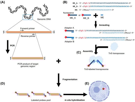 The overall workflow of Tn5-labeled DNA-FISH is illustrated. (A) The target genomic region is amplified by PCR with specific primers. (B) Fluorescently labeled adaptors (ME) are synthesized and annealed, with the Cy5.5 fluorophore indicated by the red star. ME_A (dark blue) or ME_B (blue) is annealed with ME (light blue) to form Adaptor A and Adaptor B, respectively. The blue bars correspond to the DNA sequences of the oligonucleotides. (C) The fluorescently labeled adaptors are assembled with Tn5 transposase to form the Tn5-labeled transposome. (D) The Tn5-labeled transposome performs fragmentation on the target genomic DNA, simultaneously fragmenting the DNA and integrating the fluorescently labeled adaptors to generate labeled probes. (E) The labeled probes are then used for DNA-FISH experiments.