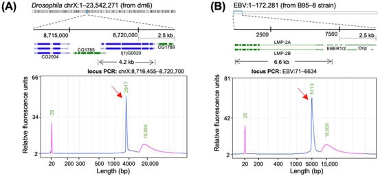 Amplification of target genomic loci. (A) PCR amplification of the target locus l(1)G0020 on the Drosophila X chromosome using S2 genomic DNA as the template. (B) PCR amplification of the target locus from the EBV genome (B95-8 strain) using GM12878 genomic DNA containing the EBV genome as the template. In both (A,B), the top bars represent the chromosome, the dashed line indicates the region of interest, blue bars represent negative-strand genes, and green bars represent positive-strand genes, the black arrows indicate the target amplification regions. Capillary electrophoresis confirms the presence of single, specific amplicons (red arrows), with the purple peak representing the marker.