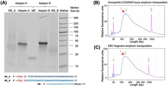 Fluorescently labeled adaptor synthesis, assembly, and probe size determination. (A) PAGE gel analysis of Adaptor A (ME and ME_A) and Adaptor B (ME and ME_B) annealing. The Cy5.5 fluorophore is shown in red. ME_A (dark blue) or ME_B (blue) is annealed with ME (light blue) to form Adaptor A and Adaptor B, respectively. The annealing of ME and ME_A/ME_B oligos at a molar ratio of 1:1.1 resulted in slower migration and distinct, specific bands, indicating successful annealing with the correct proportions. The white line indicated a splicing between ME_B lane and marker lane. (B) DNA fragment size distribution after Tn5-labeled transposome-mediated fragmentation of the Drosophila l(1)G0020 locus amplicon. (C) DNA fragment size distribution after Tn5-labeled transposome-mediated fragmentation of the EBV fragment amplicon. In both (B,C), the DNA fragments are predominantly around 150 bp, with red arrows indicating the peak positions and the purple peak representing the marker.