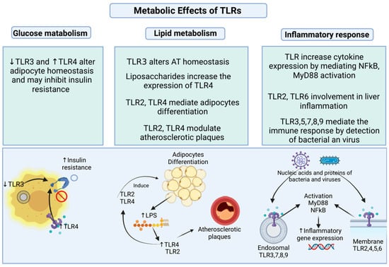 Metabolic effects of TLRs. Decreased TLR3 and increased TLR4 are involved in cellular glucose metabolism by increasing the insulin resistance. Adipose tissue (AT) homeostasis is associated with TLR3 expression [55]. TLR4 may promote insulin resistance [56]. The increase of TLR2 and TLR4 modulate in adipocyte differentiation [57]. TLR4 modulates lipid metabolism in AT and is upregulated in atherosclerotic plaques together with TLR2 [58]. Membrane and endosomal TLRs upregulate cytokines and other inflammatory genes in response to bacterial and viral antigen identification [42]. Created in BioRender. Garcia, A. (2025). https://BioRender.com/m42i307 (accessed on 28 February 2025).
