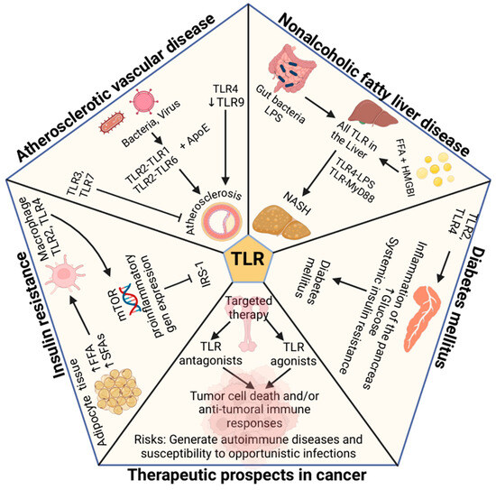 Scheme of possible interactions of TLRs in different metabolic disorders related to obesity. Bacteria or viruses in atherosclerotic plaques can activate TLRs [120]. TLR2-TLR1 and TLR2-TLR6 heterodimers are associated with atherosclerotic plaques [125]. TLR4 and decreased TLR9 are also related to the development of atherosclerotic plaques, while TLR3 and TLR7 could act as protective factors [86,128,129,130]. Increased free fatty acids (FFA) and saturated fatty acids (SFAs) trigger macrophage activity via TLR2 and TLR4 [41,137]. Macrophage activity triggers mTOR signaling, favoring the expression of pro-inflammatory molecules, leading to inactivation of insulin receptor substrate 1 (IRS-1) and insulin resistance. TLR2 and TLR4 receptors are elevated in immune diseases such as type 1 diabetes and are associated with beta-cell dysfunction and insulin resistance [60,155]. Studies show that bacterial lipopolysaccharides (LPS) derived from intestinal microflora, endogenous molecules such as high mobility group protein B1 [HMGB1] and FFA promote fat accumulation and liver inflammation via TLR4-LPS and TLR9 [178,179]. Anti-cancer TLR research focuses on activating or suppressing their immunomodulatory effects to enhance the immune response against cancer cells [224]. Created in BioRender. Garcia, A. (2025) https://BioRender.com/e62d130 (accessed on 28 February 2025).