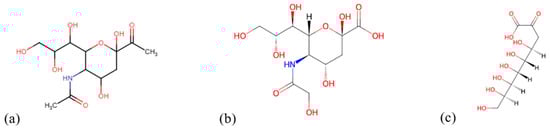 The basic structures of sialic acids. (a) N-acetylneuraminic acid (Neu5Ac), (b) N-glycolylneuraminic acid (Neu5Gc), and (c) 3-deoxy-d-glycero-d-galacto-2-nonulosonic acid (KDN). (Red indicates -O bonds, while blue indicates -NH bonds).