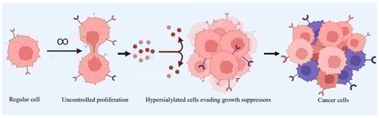 Depiction of hypersialylation from a regular cell growing beyond its regular cell cycle into cancerous cells of several heterogeneity that enables them to increase chances of survival. Created with BioRender.com.