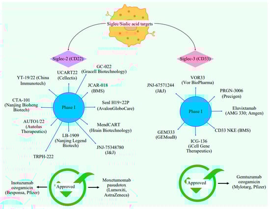 Antibody-based therapeutics are increasingly focused on targeting malignant immune cells, utilizing antibody-tethered cytotoxic functions in the form of antibody-drug conjugates (ADCs), anti-Siglec bispecific T-cell engagers (BiTE), and the better-known chimeric antigen receptor (CAR) T-cell therapies []. A summary of the agents targeting Siglecs are provided in Figure 5.
