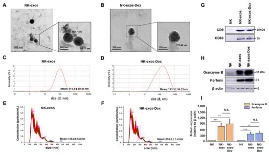 Isolation and characterization of NK-exos-Dox. (A,B) The morphologies of 50 µg of isolated NK-exos (A) and NK-exos-Dox (B) were visualized by TEM. Scale bars: 200 (left) and 100 nm (right). (C–F) Size distributions of NK-exos (C,E) and NK-exos-Dox (D,F) were analyzed using DLS (C,D) and NTA (E,F). (G,H) The expression levels of exosomal markers, including CD9 and CD63 (G), and cytotoxic proteins, including granzyme B and perforin (H) via Western blotting. β-actin was used as a loading control. Uncropped Western blot images are shown in Figures S2 and S3. (I) Quantification of protein expression normalized to β-actin. All data are presented as the mean ± SD (n = 3). ** p < 0.01 and *** p < 0.001 vs. NK cells. N.S. (no significance) vs. NK-exos.