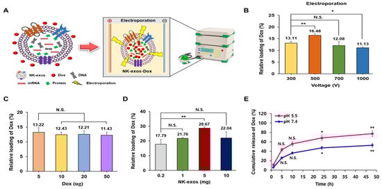 Loading and release efficiency of Dox in NK-exos using electroporation. (A) Schematic illustration of the preparation process for NK-exos-Dox. (B–D) The relative loading efficiency of Dox was determined by electroporation at the specified voltages (B), the amounts of Dox (C), and the amounts of NK-exos (D). (E) The release efficiency of Dox from NK-exos-Dox at pH 5.5 and pH 7.4. Data are shown as the mean ± SD (n = 3). * p < 0.05, ** p < 0.01, and N.S. (no significance).