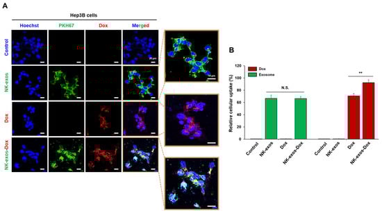 Target cells internalize exosomes through membrane fusion, endocytosis, and receptor–ligand binding []. Thus, we evaluated the internalization capacity of NK-exos-Dox in Hep3B cells, an HCC cell line. The purified NK-exos were labeled with the green fluorescent dye PKH67 to assess cellular uptake. Hep3B cells were co-incubated with free Dox, PKH67-labeled NK-exos, and PKH67-labeled NK-exos-Dox for 24 h, respectively. Thereafter, green and red fluorescence were visualized using a confocal laser scanning microscope to identify the co-localization of free Dox (red), PKH67-labeled NK-exos (green), and PKH67-labeled NK-exos-Dox (red + green). All free Dox, NK-exos, and NK-exos-Dox were internalized by Hep3B cells (Figure 3A and Figure S6). The exosome uptake efficiency of NK-exos-Dox was similar to that of NK-exos alone, but the uptake efficiency of Dox in NK-exos-Dox was higher than that of free Dox (Figure 3B). NK-exos acted as a drug carrier, enhancing Dox uptake in HCC cells. These findings indicate that NK-exos-Dox are internalized and localized in Hep3B cell cytoplasm, suggesting a strong targeting effect and potential for increased anti-cancer efficacy.