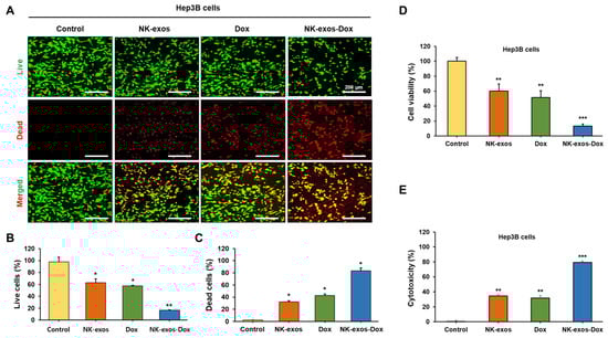 Hep3B cells (1 × 104/well) co-cultured with free Dox (5 µg), NK-exos (50 µg), and NK-exos-Dox (50 µg) were measured using a live/dead assay kit (Thermo Fisher Scientific), following the manufacturer’s protocol. After 24 h, the cells were washed and incubated in PBS containing 4 μM ethidium homodimer I (red) and 0.5 μM calcein-AM (green) for 30 min. Fluorescence images were obtained using a confocal microscope (Carl Zeiss, #LSM 880), where green and red fluorescence signals indicated living and dead cells, respectively.