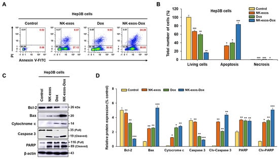 The apoptotic effects were assessed using an Annexin V-FITC apoptosis detection kit (Sigma-Aldrich), following the manufacturer’s instructions. Briefly, Hep3B cells (1 × 106/well) were seeded and co-cultured with free Dox (5 µg), NK-exos (50 µg), and NK-exos-Dox (50 µg). Cells were harvested and suspended in 500 μL of Annexin V-FITC-binding buffer. The mixture was subsequently analyzed using a flow cytometer (MACSQuant VYB; Miltenyi Biotec) according to the manufacturer’s protocol.