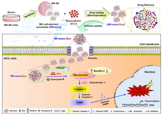 Schematic overview of NK-exos-Dox-mediated drug delivery to enhance therapeutic effects in liver cancer, specifically HCC cells. NK-exos-Dox initiate the intrinsic apoptosis pathway by transiently forming pores on the target cell membrane via perforin, releasing granzyme B and Dox into the target cells. Subsequently, they synergistically upregulate the pro-apoptotic protein (Bax) and inhibit the anti-apoptotic protein (Bcl-2), leading to the downstream activation of caspase 3 and PARP (cleaved caspase 3 and cleaved PARP). Finally, NK-exos-Dox enhance the apoptotic effect on HCC cells.