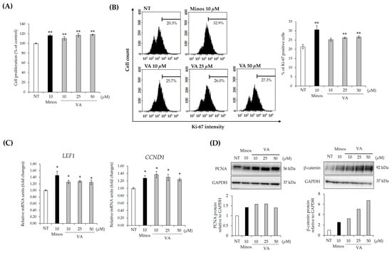 HFDPCs function as a niche for progenitor cells during the growth and resting phases of the hair cycle. Thus, HFDPC proliferation influences both the formation and regeneration of hair follicles []. To assess the effect of VA on the proliferation of HFDPCs, cells were cultured with 10, 25, or 50 μM VA. The proliferative effects of VA were evaluated using MTT and Ki67 staining assays. As shown in Figure 1A, treatment with 50 μM VA increased cell proliferation by up to 18% compared to the control group. This increase was comparable to the 16% increase observed with minoxidil, which was used as a positive control. The proportion of Ki67-positive cells increased by 24% using 50 μM VA compared to the control group (Figure 1B). We then investigated the effect of VA on the expression of genes involved in the regulation of DPC proliferation. As shown in Figure 1C, VA treatment upregulated the expression of LEF1 and CCND1 in DPCs. LEF1, a key transcription factor in the Wnt/β-catenin pathway, directly regulates CCND1 expression, which promotes cell cycle progression by activating CDK4/6 []. This activation leads to Rb phosphorylation, releasing E2F, which drives the expression of S-phase genes, facilitating HFDPC proliferation. In addition, VA increased the expression of β-catenin and PCNA (Figure 1D), both of which are associated with cell proliferation. These findings suggest that VA promotes HFDPC proliferation through the Wnt/β-catenin signaling pathway by enhancing the expression of LEF1 and CCND1. However, it remains unclear whether VA directly activates Wnt signaling or indirectly stabilizes β-catenin, requiring further investigation.