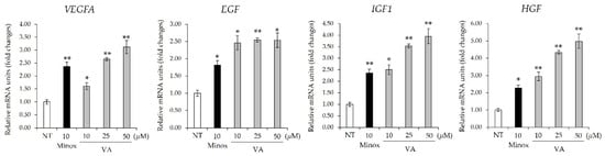 Veratric acid increases expression of growth factors. Expression levels of VEGFA, EGF, IGF1, and HGF are shown. All values were measured in triplicate (n = 3). Data are presented as mean ± SD. *, p < 0.05; **, p < 0.01.