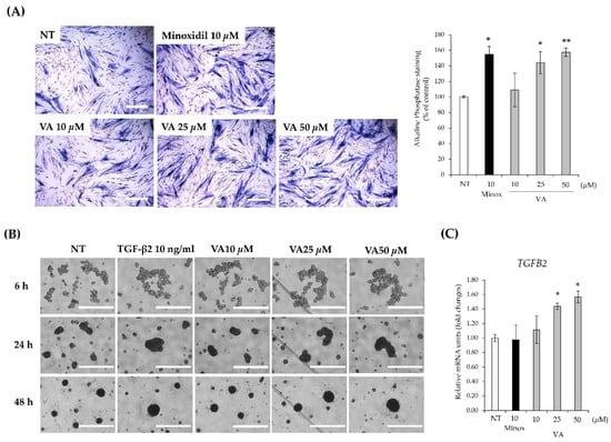 Self-aggregation is a prerequisite for HFDPCs to induce human hair follicle formation and is closely associated with hair follicle development and hair growth induction []. HFDPCs possess an intrinsic ability to self-aggregate and contribute to hair structure formation. Moreover, the expression of TGFB2 has been identified as a key regulator of HFDPC self-aggregation []. To evaluate the relationship between VA treatment and hair inductivity, we measured ALP activity and conducted 3D aggregation assays. As shown in Figure 3A, the ALP staining levels significantly increased in the VA-treated groups compared to the control group. The ALP levels increased by approximately 60% using 50 μM VA. ALP is known to be associated with hair induction and reconstruction of the bulbar structure of hair []. Additionally, VA enhanced HFDPC self-aggregation in a concentration-dependent manner, as confirmed by the 3D culture aggregation assay (Figure 3B). At 50 μM, VA exhibited an aggregation capacity comparable to that of TGF-β2, which was used as a positive control. Furthermore, VA upregulated TGFB2 expression in a concentration-dependent manner (Figure 3C). Given that TGF-β2 plays a key role in promoting DPC self-aggregation, the observed increase in TGFB2 expression following VA treatment suggests that VA facilitates self-aggregation through TGFB2 upregulation. These findings suggest that VA contributes to the restoration of hair-inductive activity by increasing ALP activity and promoting HFDPC aggregation through the upregulation of TGFB2.
